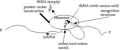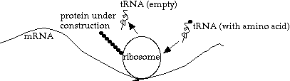 What happens inside the ribosome? A strand of tRNA (transfer RNA), with one amino acid attached, moves in. If it has the complementary codon (3 base group) to the "current" codon on the mRNA, then the amino acid is linked onto the protein chain, the ribosome advances one codon, and the now-empty tRNA is released to go find another (identical) amino acid.
