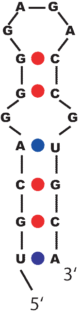 (c) Calculate free energy of the following RNA secondary structure based on the Turner Group energy parameters that can be found at http://www.bioinfo.rpi.edu/~zukerm/rna/energy/, use tables for 37 degree Celsius for RNA folding. [4 marks]