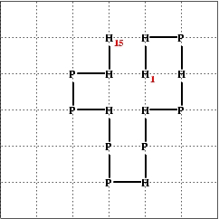 (b) Find an alternate structure for the sequence from part (a) with lower free energy <= -7. (Hint: The last hydrophobic residue has to be in contact with three other H residues) [2 marks]