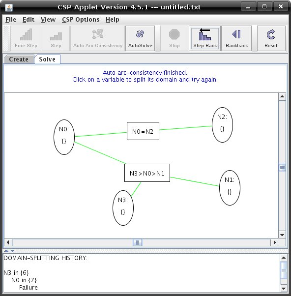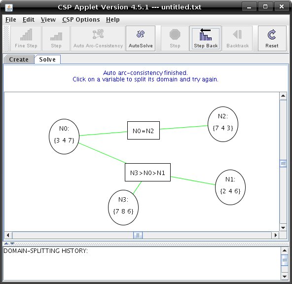 Tutorial 3: Solving a CSPFor this tutorial, we will refer to the CSP created in Tutorial 1 shown below: ![]() To start solving the CSP, switch over to 'Solve' mode by clicking on the 'Solve' tab. Some menu items which were previously unavailable in 'Create' mode are now enabled. Also, a 'Domain-splitting History' panel will appear at the bottom of the window. The toolbar buttons will change to give you solving options. The solve toolbar will initially look like the toolbar below: ![]() Generally, with CSPs, you would first make a CSP arc-consistent and then check for solutions or, if necessary, recursively split a variable's domain and make the CSP arc-consistent again. An 'arc' between variables refers to the constraint relation between the variables. An arc is arc consistent if for each domain value in one variable, there exists a value in the domain of each other variable such that the constraint between the variables is satisfied. A CSP is 'arc consistent' if all of its arcs are arc consistent. A 'solution' to a CSP is an assignment of a unique value to each variable such that all of the constraints are satisfied. This applet provides many ways to make a CSP arc-consistent: