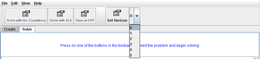 The other button and drop-down menu are for setting the horizon length. The horizon length is how many steps the STRIPS problem should be unrolled to as a CSP. A horizon length of 1 represents one action in the world, a length of 2 represents 2 steps, and so forth. The default length is 0 representing no actions being taken. To set the horizon length select a length from the drop down menu as shown below and press the "Set Horizon" button.