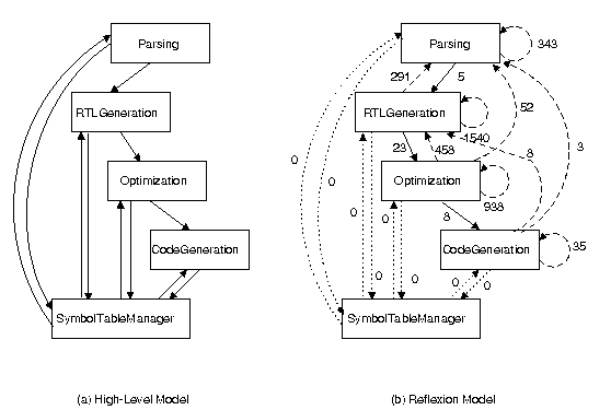 To illustrate the key features of the Software Reflexion Model technique, this page presents a sketch of its use to aid an engineer with a representative change task. The task facing the engineer is to assess the feasibility of reusing the back-end of the GNU gcc compiler with an existing graphical front-end development environment. Before the back-end may be reused, an engineer must first extract the components comprising the back-end from the source for the compiler.