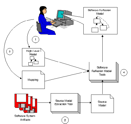 In the fourth step, the engineer uses a tool to compute a software reflexion model which