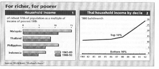 TEXT:"The extent of Thailand's wealth gap depends on how you measure it. Recent World bank figures, comparing the wealth of the top fifth of the population with that of the bottom fifth, suggest that income distribution in the early 1990s was no more unequal than in the 1970s (see chart 1). Other studies, however, which focus on narrower segments of Thai society-the richest and the poorest 10% of the population- do show a widening wealth gap. According to a paper by Yukio Ikemoto, a Japanese economist, the share of national income of the richest 10% of Thais in 1981 was 17 times that of the poorest 10%. By 1992 the multiple was 38 (see chart 2)