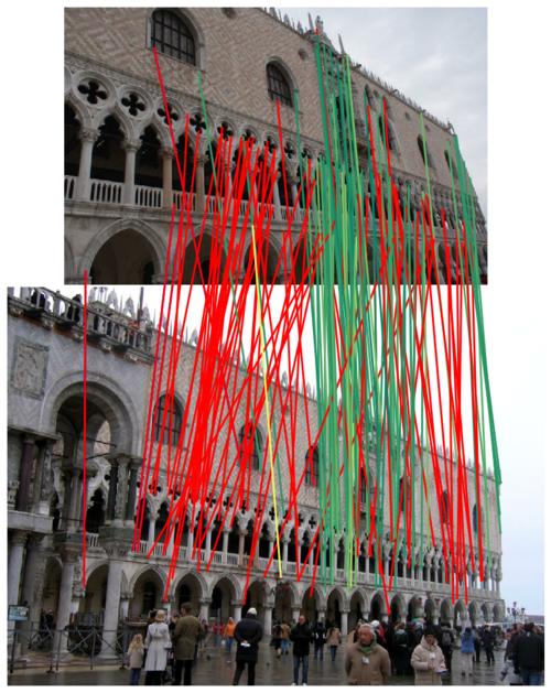 We show the inliers that survive the robust estimation loop (i.e. RANSAC), or those supplied with the submission if using custom matches, and use the depth estimates to determine whether they are correct. We draw matches above a 5-pixel error threshold in red, and those below are color-coded by their error, from 0 (green) to 5 pixels (yellow). Matches for which we do not have depth estimates are drawn in blue. Please note that the depth maps are estimates and may contain errors.
