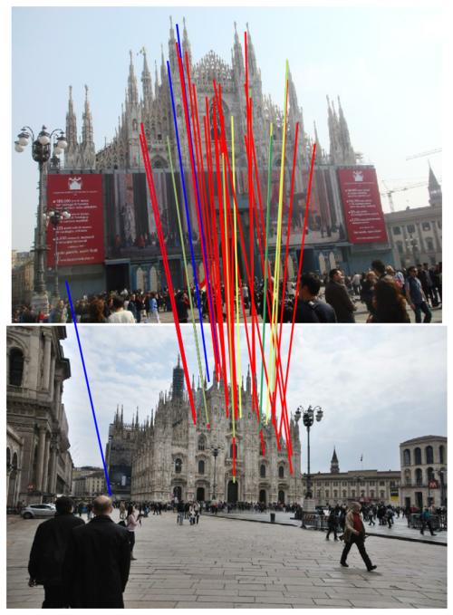 We show the inliers that survive the robust estimation loop (i.e. RANSAC), or those supplied with the submission if using custom matches, and use the depth estimates to determine whether they are correct. We draw matches above a 5-pixel error threshold in red, and those below are color-coded by their error, from 0 (green) to 5 pixels (yellow). Matches for which we do not have depth estimates are drawn in blue. Please note that the depth maps are estimates and may contain errors.