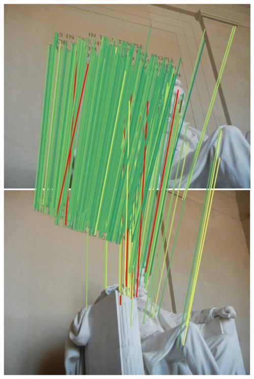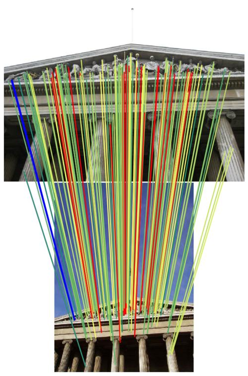 We show the inliers that survive the robust estimation loop (i.e. RANSAC), or those supplied with the submission if using custom matches, and use the depth estimates to determine whether they are correct. We draw matches above a 5-pixel error threshold in red, and those below are color-coded by their error, from 0 (green) to 5 pixels (yellow). Matches for which we do not have depth estimates are drawn in blue. Please note that the depth maps are estimates and may contain errors.