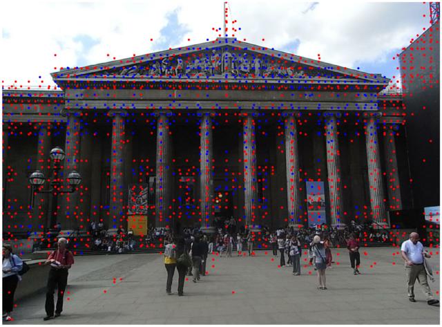 In the multi-view track we reconstruct the scene with Structure-from-Motion (Colmap) with small sets of images. We show the results for one bag of 25 images (displaying: 10). Keypoints are drawn in blue if they are part of the model, and in red otherwise.