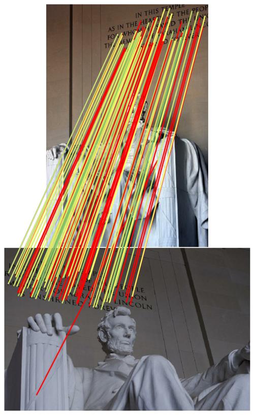 We show the inliers that survive the robust estimation loop (i.e. RANSAC), or those supplied with the submission if using custom matches, and use the depth estimates to determine whether they are correct. We draw matches above a 5-pixel error threshold in red, and those below are color-coded by their error, from 0 (green) to 5 pixels (yellow). Matches for which we do not have depth estimates are drawn in blue. Please note that the depth maps are estimates and may contain errors.