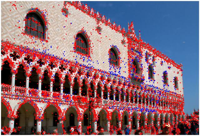 In the multi-view track we reconstruct the scene with Structure-from-Motion (Colmap) with small sets of images. We show the results for one bag of 25 images (displaying: 10). Keypoints are drawn in blue if they are part of the model, and in red otherwise.