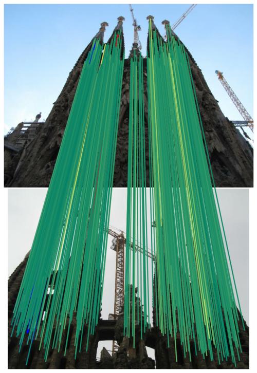 We show the inliers that survive the robust estimation loop (i.e. RANSAC), or those supplied with the submission if using custom matches, and use the depth estimates to determine whether they are correct. We draw matches above a 5-pixel error threshold in red, and those below are color-coded by their error, from 0 (green) to 5 pixels (yellow). Matches for which we do not have depth estimates are drawn in blue. Please note that the depth maps are estimates and may contain errors.
