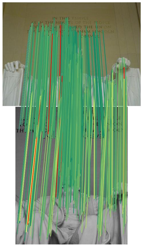 We show the inliers that survive the robust estimation loop (i.e. RANSAC), or those supplied with the submission if using custom matches, and use the depth estimates to determine whether they are correct. We draw matches above a 5-pixel error threshold in red, and those below are color-coded by their error, from 0 (green) to 5 pixels (yellow). Matches for which we do not have depth estimates are drawn in blue. Please note that the depth maps are estimates and may contain errors.