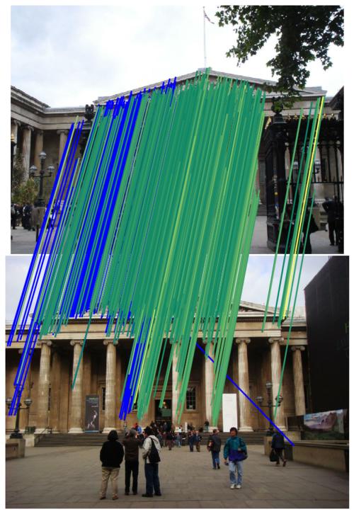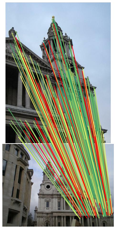 We show the inliers that survive the robust estimation loop (i.e. RANSAC), or those supplied with the submission if using custom matches, and use the depth estimates to determine whether they are correct. We draw matches above a 5-pixel error threshold in red, and those below are color-coded by their error, from 0 (green) to 5 pixels (yellow). Matches for which we do not have depth estimates are drawn in blue. Please note that the depth maps are estimates and may contain errors.