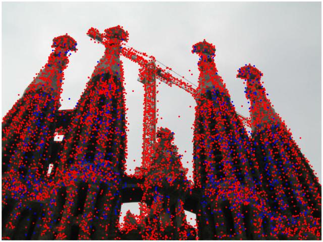 In the multi-view track we reconstruct the scene with Structure-from-Motion (Colmap) with small sets of images. We show the results for one bag of 25 images (displaying: 10). Keypoints are drawn in blue if they are part of the model, and in red otherwise.