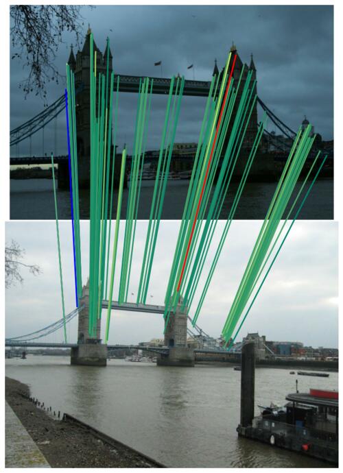 We show the inliers that survive the robust estimation loop (i.e. RANSAC), or those supplied with the submission if using custom matches, and use the depth estimates to determine whether they are correct. We draw matches above a 5-pixel error threshold in red, and those below are color-coded by their error, from 0 (green) to 5 pixels (yellow). Matches for which we do not have depth estimates are drawn in blue. Please note that the depth maps are estimates and may contain errors.