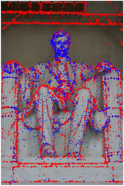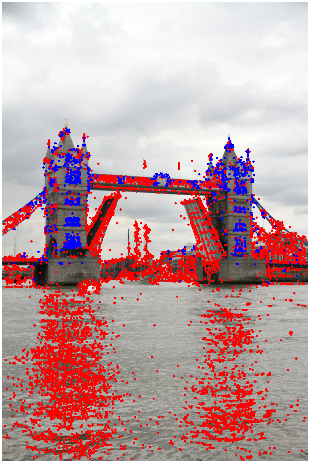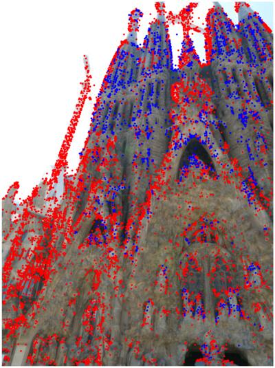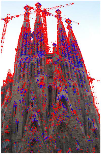 In the multi-view track we reconstruct the scene with Structure-from-Motion (Colmap) with small sets of images. We show the results for one bag of 25 images (displaying: 10). Keypoints are drawn in blue if they are part of the model, and in red otherwise.