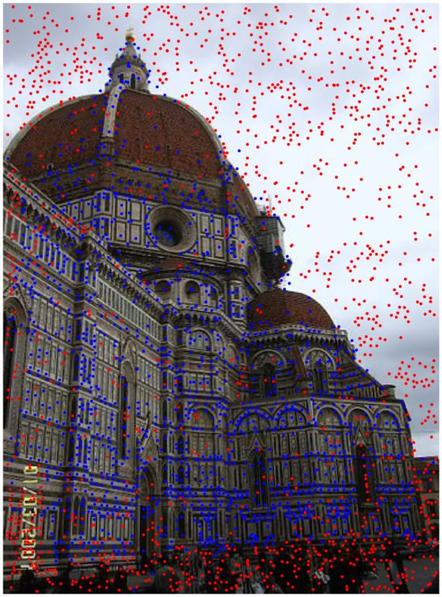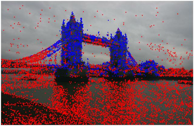 In the multi-view track we reconstruct the scene with Structure-from-Motion (Colmap) with small sets of images. We show the results for one bag of 25 images (displaying: 10). Keypoints are drawn in blue if they are part of the model, and in red otherwise.