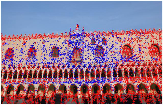 In the multi-view track we reconstruct the scene with Structure-from-Motion (Colmap) with small sets of images. We show the results for one bag of 25 images (displaying: 10). Keypoints are drawn in blue if they are part of the model, and in red otherwise.