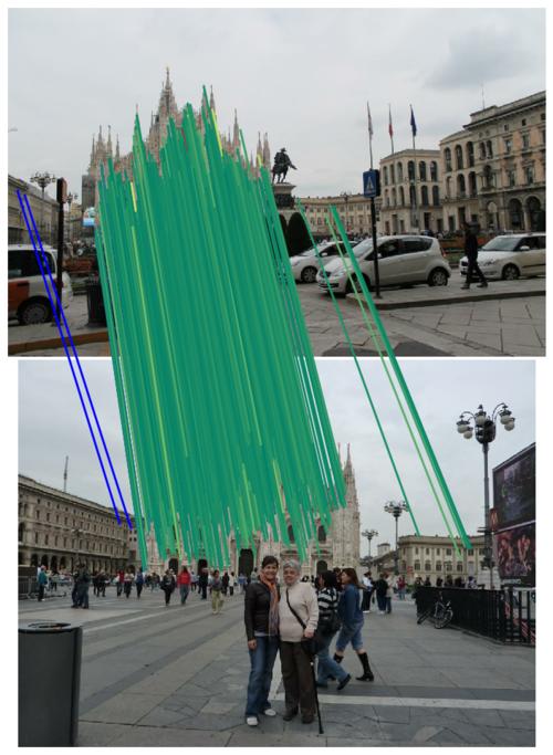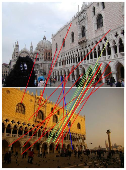 We show the inliers that survive the robust estimation loop (i.e. RANSAC), or those supplied with the submission if using custom matches, and use the depth estimates to determine whether they are correct. We draw matches above a 5-pixel error threshold in red, and those below are color-coded by their error, from 0 (green) to 5 pixels (yellow). Matches for which we do not have depth estimates are drawn in blue. Please note that the depth maps are estimates and may contain errors.
