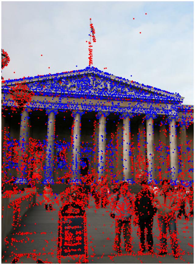 In the multi-view track we reconstruct the scene with Structure-from-Motion (Colmap) with small sets of images. We show the results for one bag of 25 images (displaying: 10). Keypoints are drawn in blue if they are part of the model, and in red otherwise.