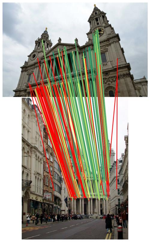 We show the inliers that survive the robust estimation loop (i.e. RANSAC), or those supplied with the submission if using custom matches, and use the depth estimates to determine whether they are correct. We draw matches above a 5-pixel error threshold in red, and those below are color-coded by their error, from 0 (green) to 5 pixels (yellow). Matches for which we do not have depth estimates are drawn in blue. Please note that the depth maps are estimates and may contain errors.