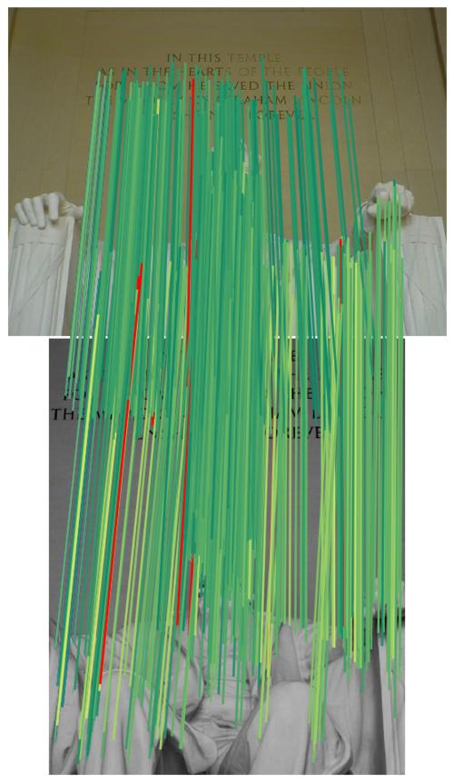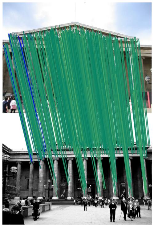 We show the inliers that survive the robust estimation loop (i.e. RANSAC), or those supplied with the submission if using custom matches, and use the depth estimates to determine whether they are correct. We draw matches above a 5-pixel error threshold in red, and those below are color-coded by their error, from 0 (green) to 5 pixels (yellow). Matches for which we do not have depth estimates are drawn in blue. Please note that the depth maps are estimates and may contain errors.