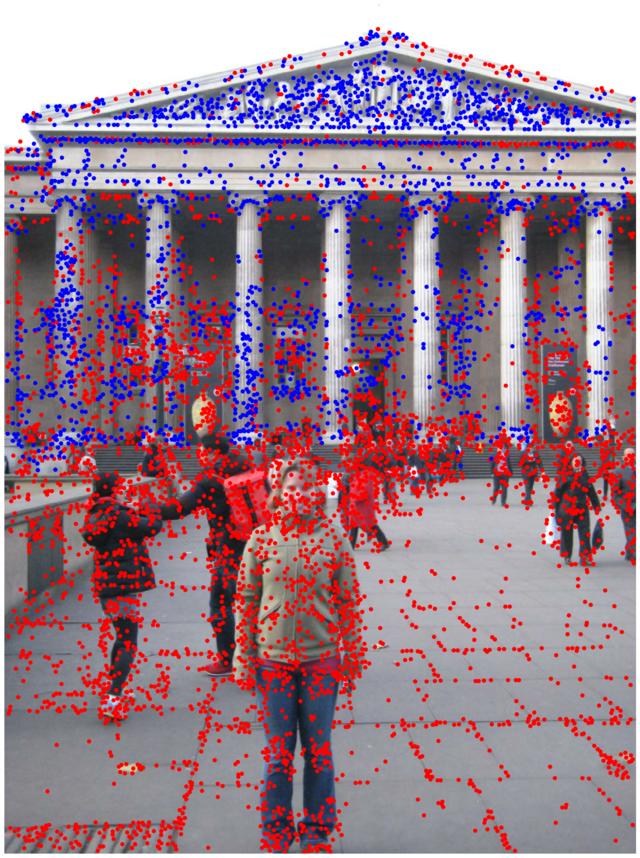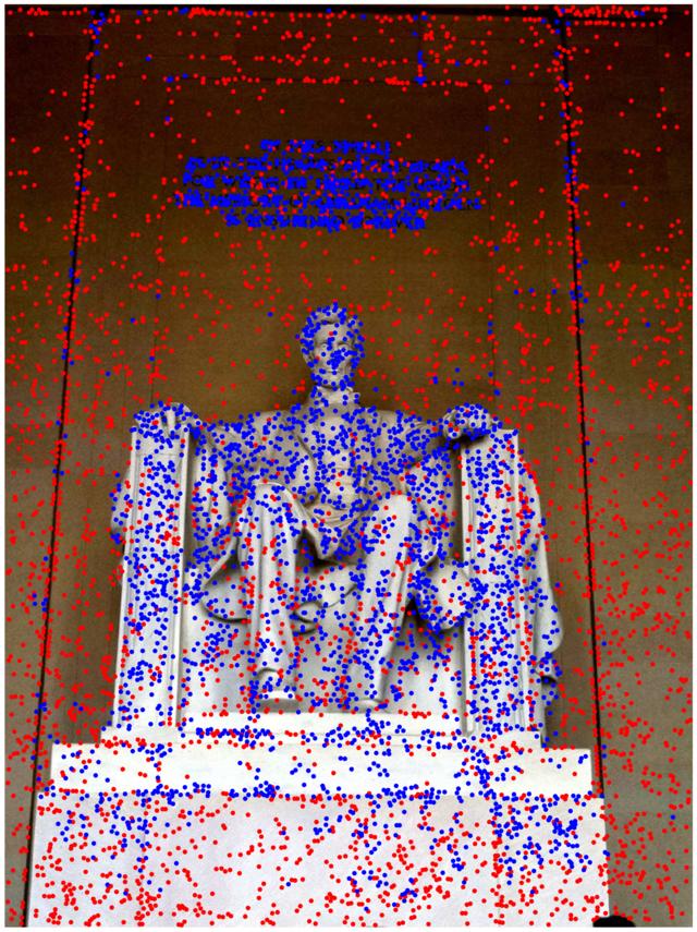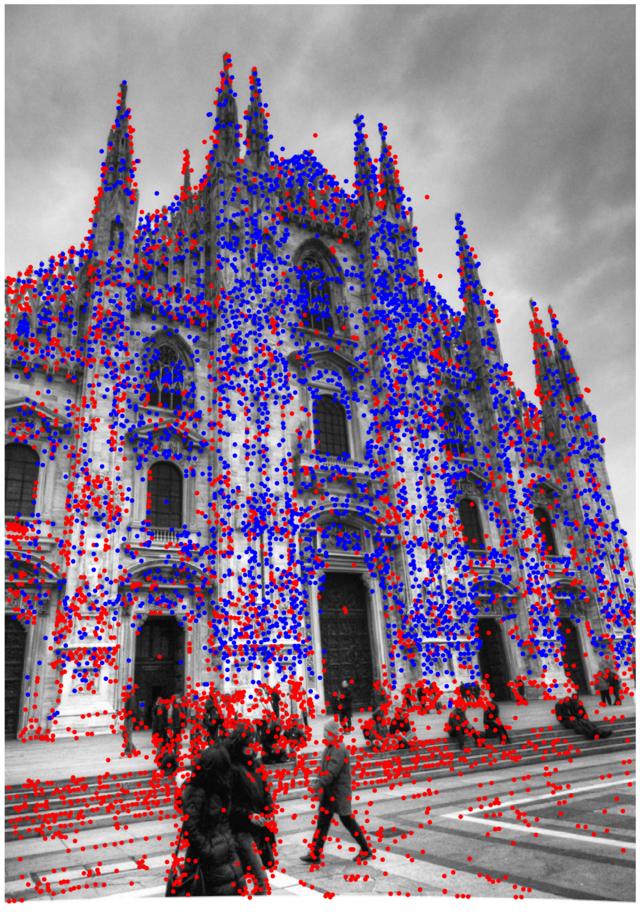 In the multi-view track we reconstruct the scene with Structure-from-Motion (Colmap) with small sets of images. We show the results for one bag of 25 images (displaying: 10). Keypoints are drawn in blue if they are part of the model, and in red otherwise.