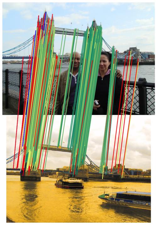 We show the inliers that survive the robust estimation loop (i.e. RANSAC), or those supplied with the submission if using custom matches, and use the depth estimates to determine whether they are correct. We draw matches above a 5-pixel error threshold in red, and those below are color-coded by their error, from 0 (green) to 5 pixels (yellow). Matches for which we do not have depth estimates are drawn in blue. Please note that the depth maps are estimates and may contain errors.