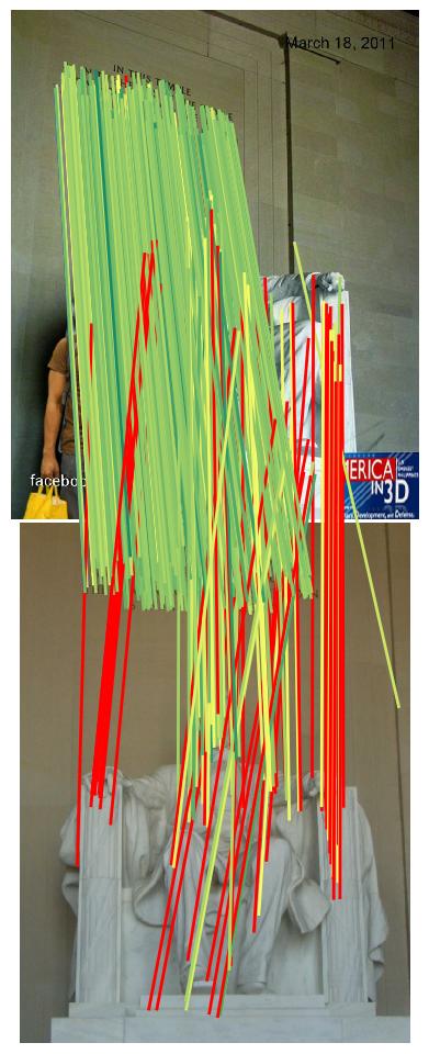We show the inliers that survive the robust estimation loop (i.e. RANSAC), or those supplied with the submission if using custom matches, and use the depth estimates to determine whether they are correct. We draw matches above a 5-pixel error threshold in red, and those below are color-coded by their error, from 0 (green) to 5 pixels (yellow). Matches for which we do not have depth estimates are drawn in blue. Please note that the depth maps are estimates and may contain errors.
