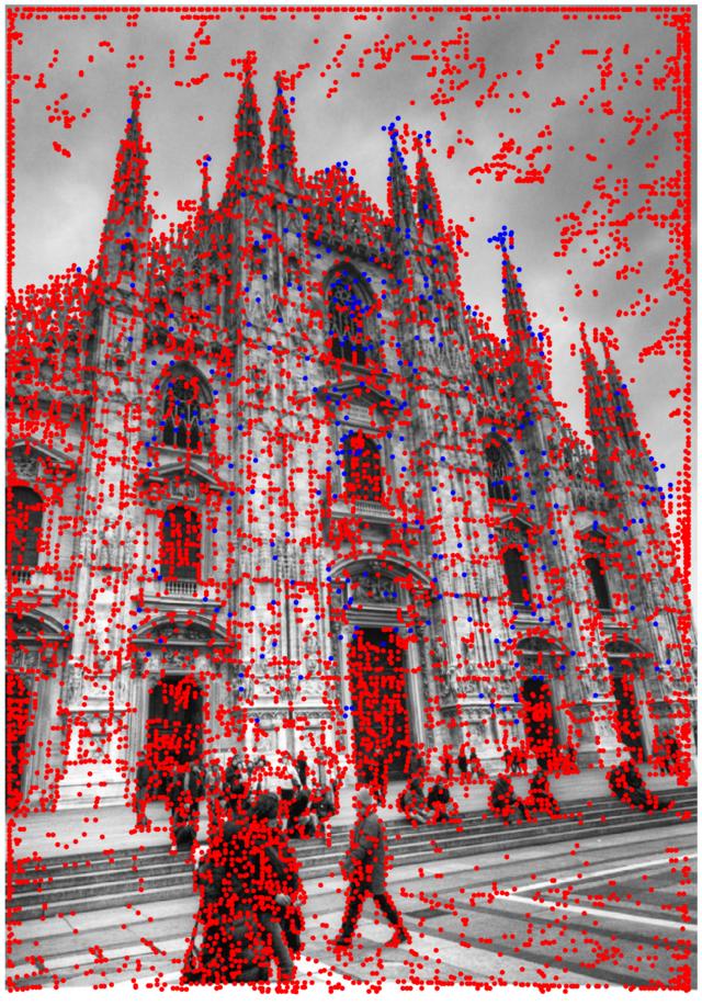 In the multi-view track we reconstruct the scene with Structure-from-Motion (Colmap) with small sets of images. We show the results for one bag of 25 images (displaying: 10). Keypoints are drawn in blue if they are part of the model, and in red otherwise.