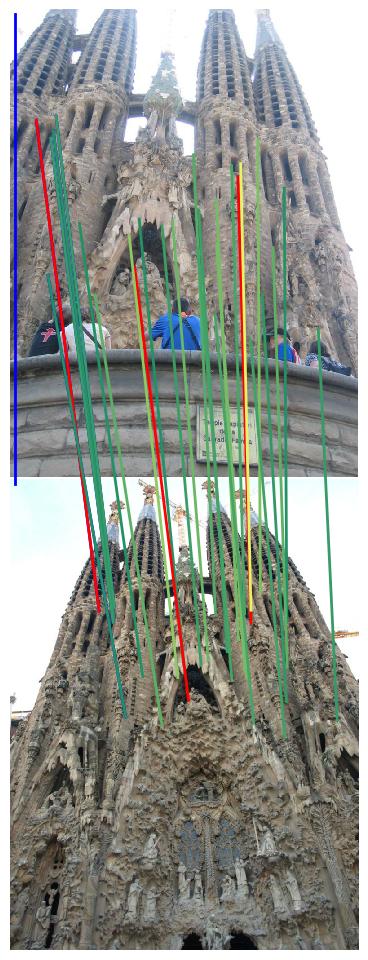 We show the inliers that survive the robust estimation loop (i.e. RANSAC), or those supplied with the submission if using custom matches, and use the depth estimates to determine whether they are correct. We draw matches above a 5-pixel error threshold in red, and those below are color-coded by their error, from 0 (green) to 5 pixels (yellow). Matches for which we do not have depth estimates are drawn in blue. Please note that the depth maps are estimates and may contain errors.