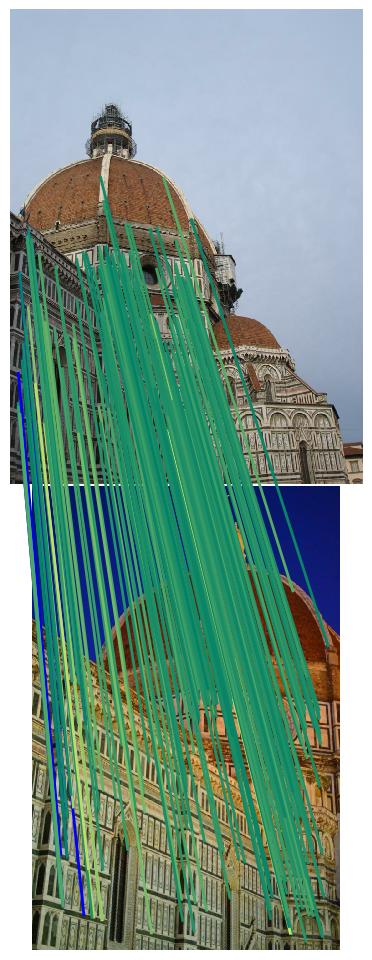 We show the inliers that survive the robust estimation loop (i.e. RANSAC), or those supplied with the submission if using custom matches, and use the depth estimates to determine whether they are correct. We draw matches above a 5-pixel error threshold in red, and those below are color-coded by their error, from 0 (green) to 5 pixels (yellow). Matches for which we do not have depth estimates are drawn in blue. Please note that the depth maps are estimates and may contain errors.