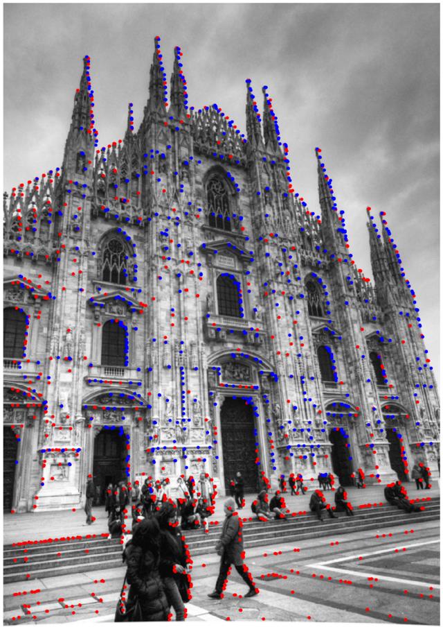 In the multi-view track we reconstruct the scene with Structure-from-Motion (Colmap) with small sets of images. We show the results for one bag of 25 images (displaying: 10). Keypoints are drawn in blue if they are part of the model, and in red otherwise.