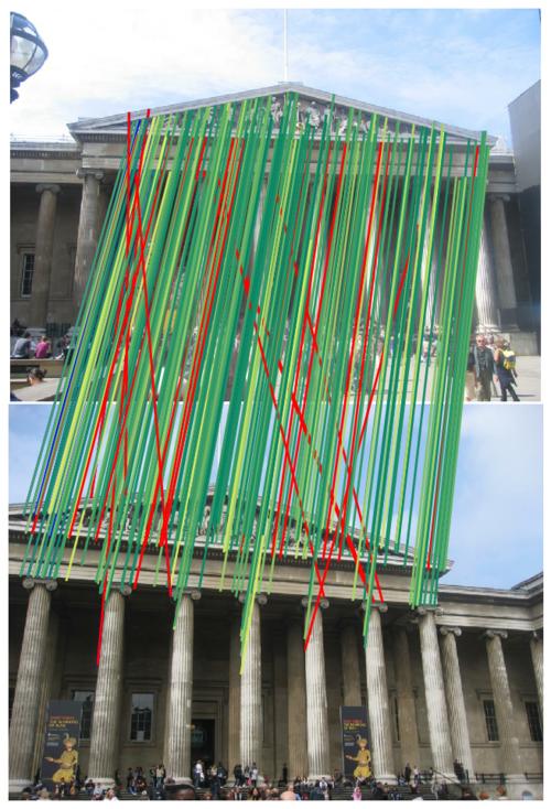 We show the inliers that survive the robust estimation loop (i.e. RANSAC), or those supplied with the submission if using custom matches, and use the depth estimates to determine whether they are correct. We draw matches above a 5-pixel error threshold in red, and those below are color-coded by their error, from 0 (green) to 5 pixels (yellow). Matches for which we do not have depth estimates are drawn in blue. Please note that the depth maps are estimates and may contain errors.