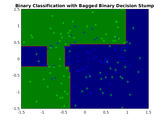 options_bg.nModels = 20; options_bg.subModel = @ml_binaryclass_stump; model_bg = ml_binaryclass_bagging(Xtrain, ytrain, options_bg); yhat_bg = model_bg.predict(model_bg, Xtest); testError_bg = mean(yhat_bg ~= ytest); fprintf('Averaged misclassification test error with %s is: %.3f\n', ... model_bg.name, testError_bg) figure; plot2DClassifier(Xtrain, ytrain, model_bg); hold on; for k = 1:length(model_bg.trainModels); plot2DLine(model_bg.trainModels{k}); alpha(0) end plot2DClassifier_red(Xtrain, ytrain, model_bg); generateData_robustness