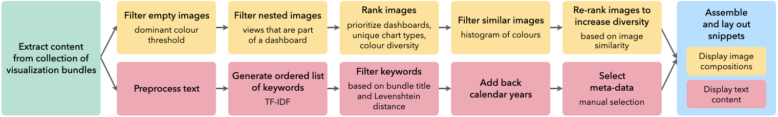 Fig. 3. VizSnippets computational pipeline to compress visual and textual content of visualization bundles into representative snippets.