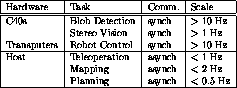 We chose to build a large amount of our computing requirements onboard our mobile robot. Figure 6 shows the computing system. A VME card cage, visible in Figure 5, holds four INMOS Transputer processors plus two Texas Instruments TMS320C40 digital signal processors. Our experience with the Vision Engine[13] showed that Transputers are suitable for implementing real-time controllers because they have low-latency communication capabilities and built-in lightweight scheduling and context switching. However, they lack the computational power and communication bandwidth for vision processing. For this reason we use C40 DSP processors, which support 25 MFlops computation plus 20MB/s communications, for the image acquisition and processing functions onboard the robot.