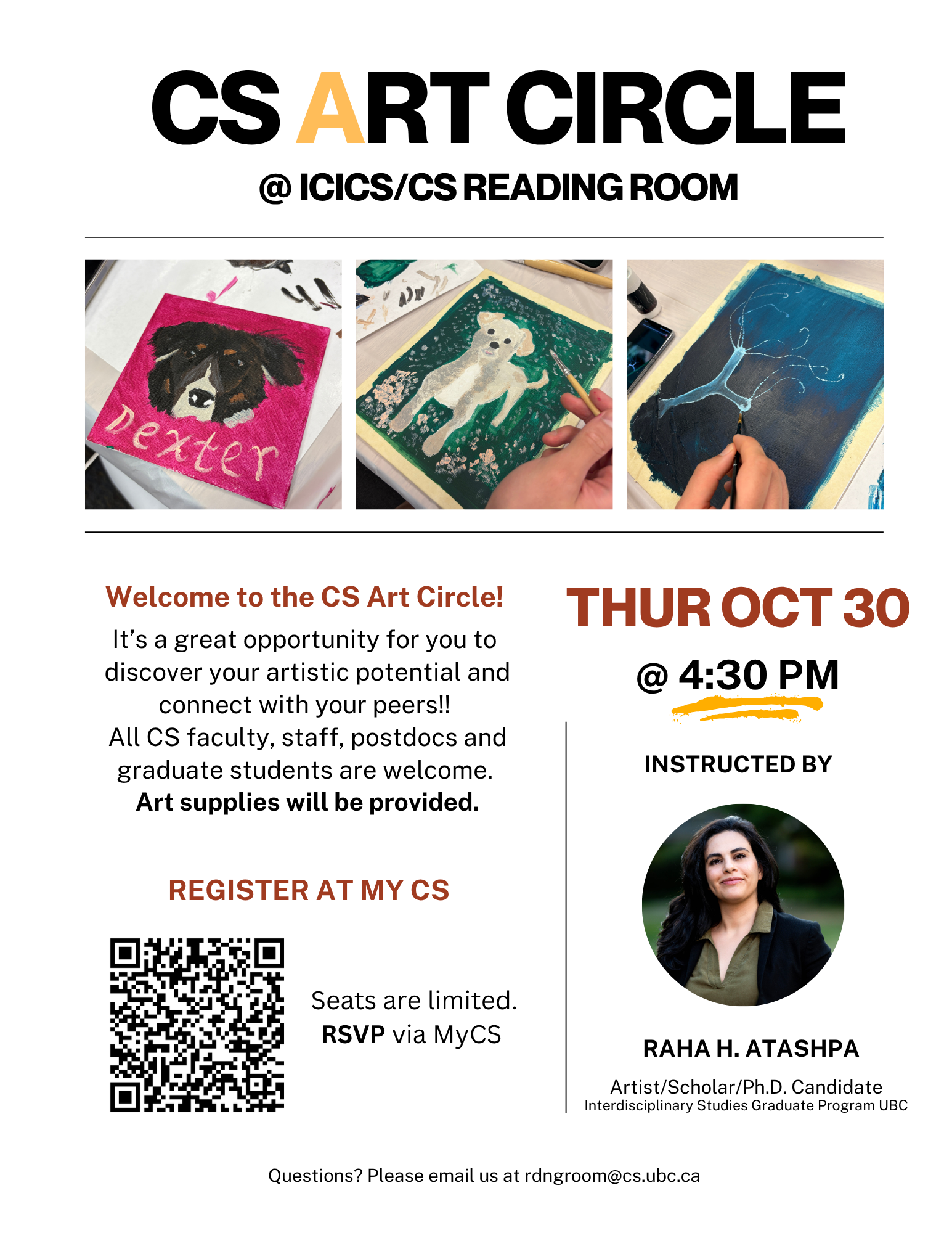 - Thursday, October 30th, 4:30 PM-6:00 PM: CS Art Circle at the ICICS/CS Reading Room. All CS faculty, staff, postdocs, and grad students are welcome. Please sign up through MyCS at https://my.cs.ubc.ca/event/2025/10/cs-art-circle-icics-cs-reading-room