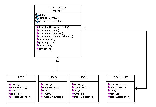 In our example, all the subclasses of MEIDA have to overridden countMEDIA(), add(), and remove(). For an MEDIA_LIST object, an invocation of the countMEDIA(), for example, results in it sending a countMEDIA( ) message to each of its components in turn. Combining inheritance and aggregation, the relationships among MEDIA, MEDIA_LIST, TEXT, AUDIO, and VIDEO form the composite pattern. The composite pattern suggests that both the composite and the component objects should have the same interface. The advantage of such a pattern is that clients will treat both the composite and the component objects in the same way. The composite pattern in UML [4] and the Java implementation of MEDIA, VIDEO, and MEDIA_LIST are shown in Figure 2a and 2b respectively.
