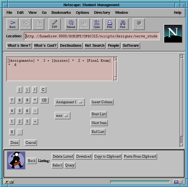 The grade database provides several reporting options. The default view is that a table is presented with one student per row. Each column contains student information such as the student identification, grades, comments, etc. The columns are defined by the course designer. Clicking on the heading for one column sorts the entire table according to the contents of that column. Clicking on the edit link at the top of a column allows new values to be entered for all students into that column. In the case that the column is a derived column (where the entry is derived from other columns - to calculate a final grade for example) then clicking the edit link presents a calculator-like tool which allows the entry of a formula to be used in column calculation. Clicking on the graph link at the top of a numeric column presents a distribution histogram and statistics for that column's values.