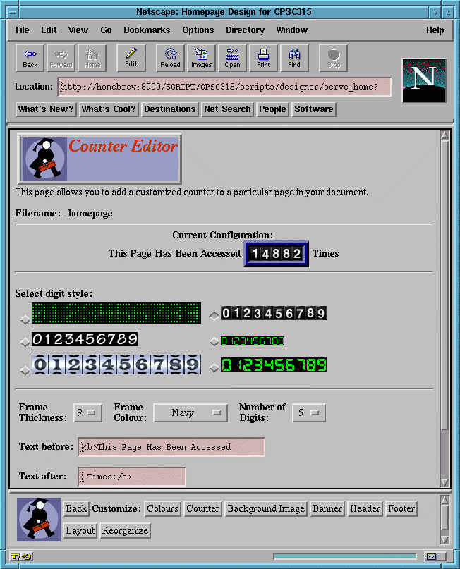 Following the example further, clicking on the Counter button presents a page which allows the inclusion of a counter on the homepage. The counter can then be configured for digit style, color, etc using the screen shown below.