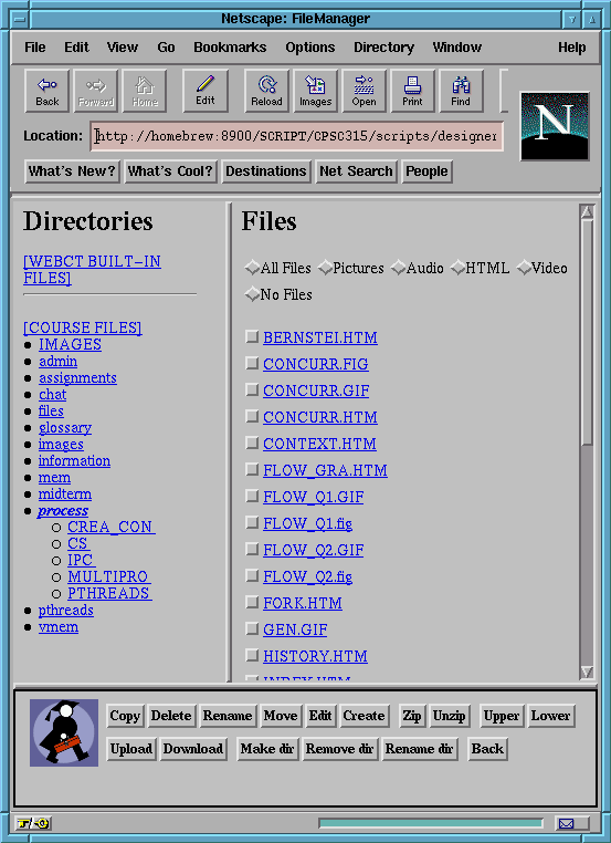 The file manager presents a hierarchical view of the course files to the designer much like the file system of Unix or Windows 95. The designer can create directories, move files and directories into other directories, delete files, upload files or file archives, un-archive and archive files, etc. The file manager also allows the designer to edit html or text files, and provides a previewer for image, audio and video files. Shown below is a view of the WebCT file manager.