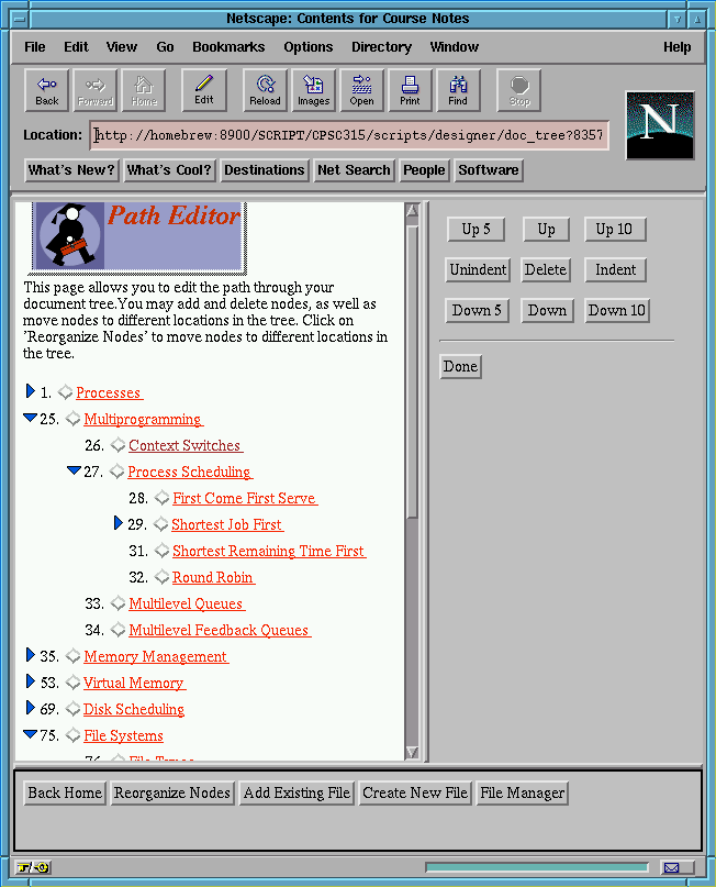 Another example of the WebCT designer interface is the path editor. The path editor allows the placement of content pages on a WebCT path, and allows the reordering, indentation, and un-indentation of those pages. Again. the path as seen by the student is shown in the top frame, and the designer options are presented in the bottom frame. The path editor also uses a second designer-specific frame (to the right of the displayed path) to present extra options applicable to path editing. Below is an example view of a path-editing session.