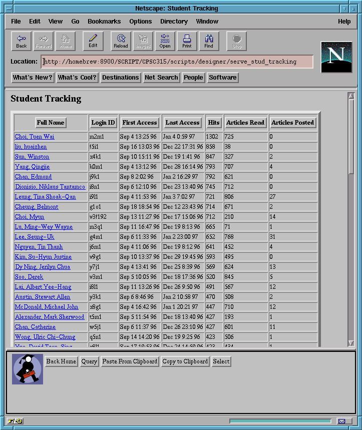 Nested queries can also be performed in student management to display patrial student lists. For example, the instructor could display only those students that scored better than 50% on an assignment, and are in a particular course section. Then clicking on graph presents statistics and a histogram only for those selected students. This is useful in many circumstances, including the comparison of performance for different groups of students in a class (for example on-line students versus lecture-based students). As with student progress tracking, the student list resulting from a query can be copied to the WebCT clipboard for export to the to-field of an e-mail message (for example to send congratulatory notes to high achievers), or the the progress tracking tool (for example to test for access correlation).