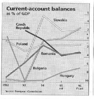 TEXT:"The overall current-account deficit for the six biggest economies of Central Europe (Poland, Hungary, the Czech Republic, Slovakia, Romania and Bulgaria) is forecast to be $6.2 billion in the 1996, or 2% of their total GDP. But, as the chart shows, there are considerable differences between countries. Although the Europe Commission expects the Hungarian current-account deficit to shrink, it is likely to remain the largest in the region.