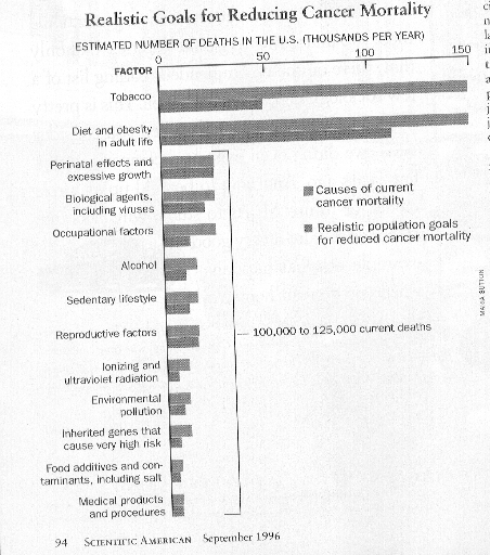 Text: "Tobacco and diet, including the latter's effects of obesity, account for about 300,000 cancer fatalities every year in the U.S. - or about 60% of the country annual cancer mortality. Researchers hope these numbers, particularly those for tobacco-caused deaths, can be significantly reduced. Other factors, however, such as those dating to around the time of birth (perinatal factors) or those related to reproduction, are expected to be much more resistant to improvement"