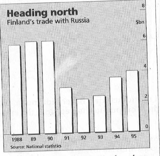 TEXT:"Finland's trade with russia has yet to regain the levels of its old trade with tha Soviet block, which consisted largely of bartering Finnish capital goods for Soviet oil. That arrangement collapsed with the Soviet Union. But a new entrepreneurial trade has taken its place and is growing fast".