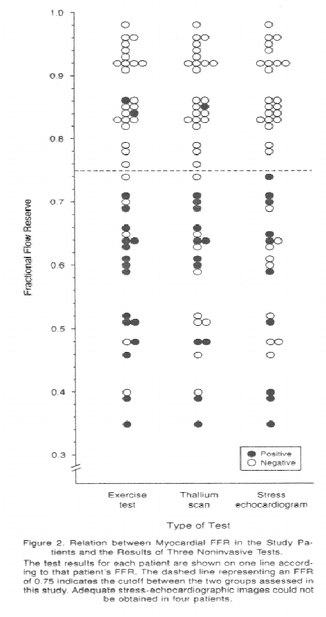 TEXT:"The relation between FFR and non-invasive tests is shown in fig. 2. In all 21 patients with an FFR below 0.75, signs of myocardial ischemia could be induced by at least one non-invasive text. All positive tests in this group were repeated after revascularization, and the result reverted to normal. In 21 of the 24 patients with an FFR of 0.75 or higher, all the non-invasive tests were negative. Of the remaining three patients, two had positive exercise electrocardiograms and one had a positive thallium scan. In these three patients the FFR method yielded false negative results, because the evidence of inducible ischemia was present despite an FFR of 0.75 or higher. The overall sensitivity, specificity, positive and negative predictive value and accuracy of FFR were 88, 100, 100, 88 and 93 percent , respectively."