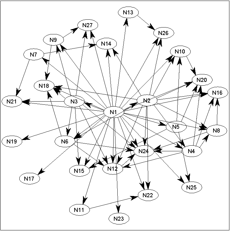 err_DS = sum(adj_DS(:)~=DAG(:)) err_OS = sum(adj_OS(:)~=DAG(:)) err_DS_SC = sum(adj_DS_SC(:)~=DAG(:)) err_DS_L1MB = sum(adj_DS_L1MB(:)~=DAG(:)) drawGraph(adj_DS_L1MB,'labels',nodeNames); >> err_DS = 37 >> err_OS = 31 >> err_DS_SC = 52 >> err_DS_L1MB = 0Finally, we output the number of structural errors made by the different methods, and draw the graph corresponding to the L1MB-pruned DAG-Search (requires Graphviz). In this case, the L1MB-pruned DAG-Search finds the true structure (in fact, the L1MB-pruned DAG-Search finds the true structure twice, while none of the other methods found it yet):