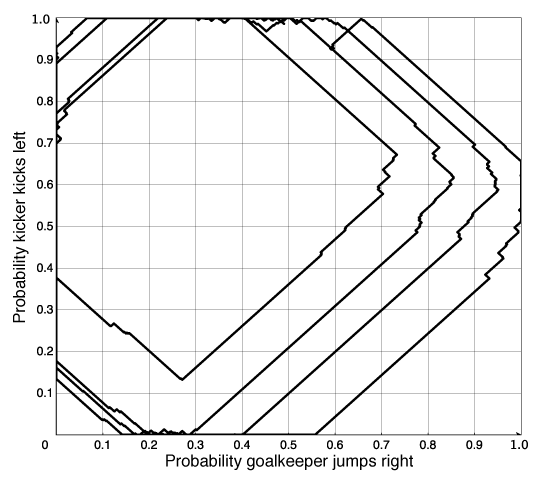 If there is only a randomized equilibrium, as in the penalty kick game of Example 10.9, this algorithm tends to cycle around the equilibrium.